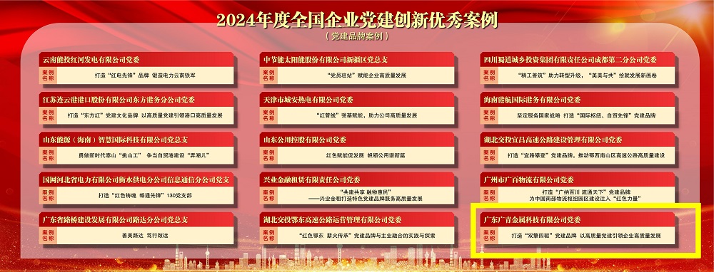 8月3日,以“以高质量党建赋能新质生产力发展,在改革开放中肩负起中国式现代化伟大使命”为主题的2024全国企业党建(案例)研讨会暨第四届企业党建创新优秀案例发布仪式在北京召开。会上公布了“2024年度全国企业党建创新优秀案例”名单,广东广青金属科技有限公司党委《打造“双擎四驱”党建品牌 以高质量党建引领企业高质量发展》案例被评选为“2024年度全国企业党建创新优秀案例(党建品牌案例)”。