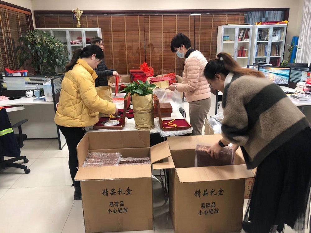 2月2日上午,青拓集团有限公司行政总经理钟盛江带领部门人员忙着筹备喜报、获奖证书、慰问金、年货等物资,在春节来临前夕赠送给获集团级先进的员工及家属。