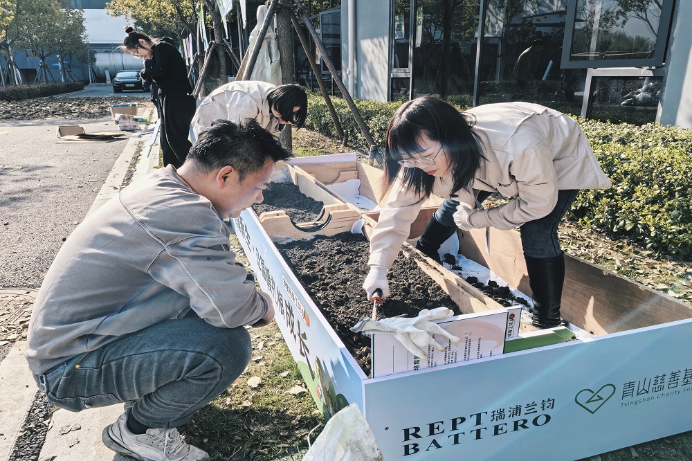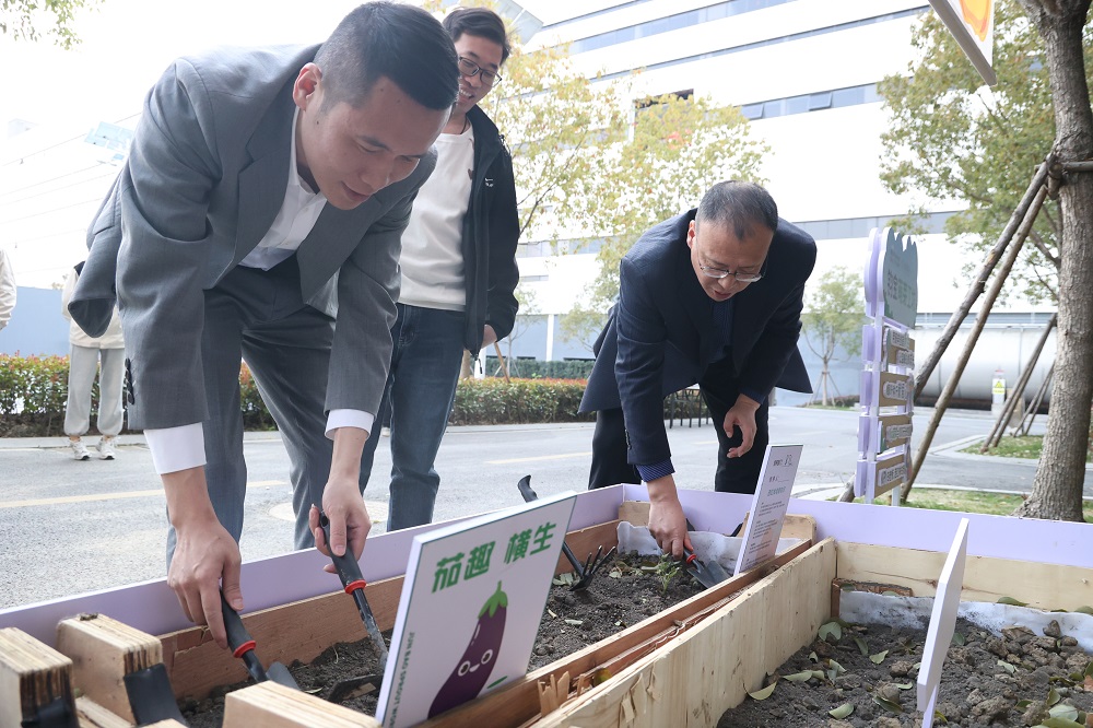 随后,石江珠与赵栋明共同种下象征承诺的“时间胶囊”——首株有机菜苗。未来,嘉善基地各部门将分片种植蔬菜,收获的作物将用于慈善活动,实现“生态新生、爱心新生、希望新生”三重价值。